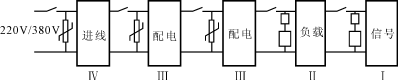 依據(jù)線路絕緣結(jié)構(gòu)理論及IEC61312、IEC664-1、IEC61643、GB50097-1994(2000年版)等標(biāo)準(zhǔn),對建筑物和電氣設(shè)備(如第三類防雷建筑物)進(jìn)行感應(yīng)過電壓防護(hù)的絕緣結(jié)構(gòu),如圖1所示。其對應(yīng)保護(hù)級別如表1所示。