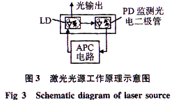 由圖3可以看出:LD與監(jiān)測二極管是集成在一起的元器件。流入LD的電流經(jīng)過APC電路的預(yù)偏置電流。APC電路通過電流負反饋電路抑制由于溫度變化、器件老化等引起的光功率的變化。APC電路部分采用背向光反饋自動偏置控制方式,即用半導(dǎo)體激光器組件中的PD光電二極管監(jiān)測LD背向輸出的光功率。因為背向輸出光功率能跟蹤前向輸出光功率的變化,通過閉環(huán)控制系統(tǒng)就可以調(diào)節(jié)激光器的電流,達到輸出穩(wěn)定光功率的目的。
