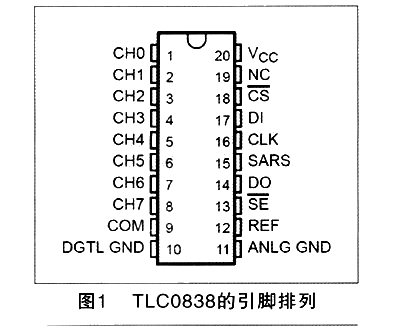 TLC0838的引腳排列如圖1所示,其中CH0~CH7為模擬輸入端;Cs為片選端;DI為串行數(shù)據輸入,該端僅在多路器尋址時(MUX Settling Time)才被檢測;DO為A/D轉換結果的三態(tài)串行輸出端;CLK為時鐘;SARS為轉換狀態(tài)輸出端,該端為高電平時,表示轉換正在進行,為低電平則表示轉換完成;REF為參考電壓輸入端;VCC為電源;DGTLGND為數(shù)字地,ANGL GND為模擬地,COM公共端;/SE為數(shù)據保持,輸出,該端為高電平時,數(shù)據保存在數(shù)據線上,該端為低電平時,數(shù)據輸出。