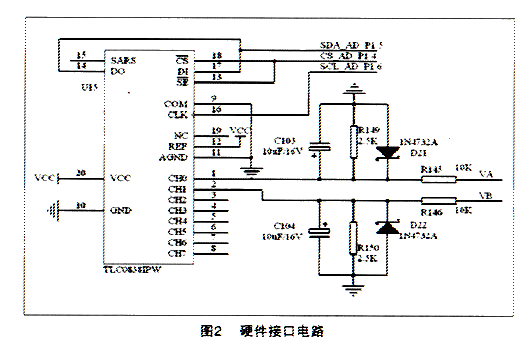 由于篇幅有限,圖中只畫出第0、1通道,模擬輸入接口檢測電路,VA接太陽能電壓正極,VB蓄電池電壓正極。其他通道接口電路與此相同。