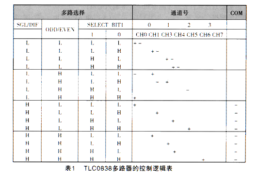 TLC0838可通過和微控制器相連的串行數(shù)據鏈路來傳送控制命令,在使用前需要對通道進行選擇和輸入端進行配置,其控制邏輯表如表1所列。