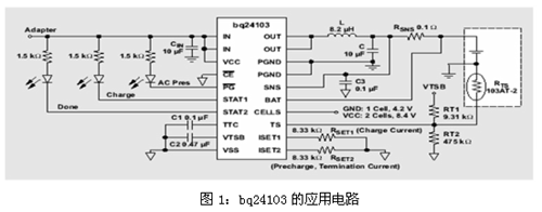基于bq24103的設(shè)計(jì)范例如圖1所示。在這個(gè)設(shè)計(jì)中,適配器電壓為12V,電池組為1800mAH的2S鋰離子電池,電池穩(wěn)壓要求為4.2V/節(jié),電池截止電壓為3V/節(jié),快速充電電流為1.2A,預(yù)充電與終止電流為120mA,安全定時(shí)器滿量程為5小時(shí)。下面將通過(guò)計(jì)算選擇合適的電感、電容和電阻元件。