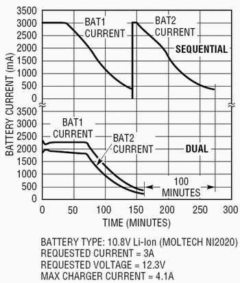 傳統(tǒng)上,雙電池系統(tǒng)是順序放電系統(tǒng),允許順序消耗電池電量(先消耗電池1,再消耗電池2),以簡(jiǎn)單地延長(zhǎng)總的電池工作時(shí)間。ltc1760采用了專有模擬控制技術(shù),可允許安全地對(duì)兩個(gè)電池并行充電或放電。圖1是一個(gè)采用ltc1760的雙電池系統(tǒng)的簡(jiǎn)化原理圖。這種結(jié)構(gòu)使充電速度提高了50%,電池工作時(shí)間延長(zhǎng)了10%。此外,并行放電不僅增強(qiáng)了電流能力,而且還降低了i2r損耗并改善了在極高負(fù)載條件下的電壓調(diào)節(jié)能力。降低i2r損耗和改善電壓調(diào)節(jié)都延長(zhǎng)了時(shí)序解決方案的總放電時(shí)間(見圖2)。