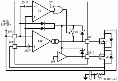 每條電源通路都由兩個(gè)背對(duì)背的pfet組成,這兩個(gè)pfet與短路檢測(cè)電阻rsc串聯(lián)。電池電源通路(powerpathtm)開關(guān)驅(qū)動(dòng)器等效電路如圖 5 所示。