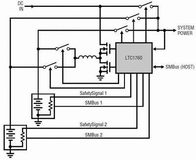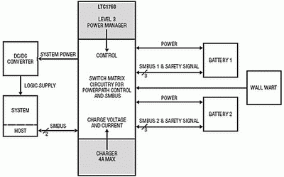 圖3 ltc1760雙電池充電器/選擇器系統(tǒng)架構(gòu)