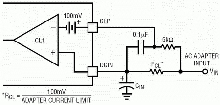 如圖4所示,這個(gè)電路限制充電電流以防止系統(tǒng)功率升高時(shí)交流適配器過載。要設(shè)定輸入電流限制,重要的就是要化墻式配適器的額定電流。限流電阻可以通過下兩式來計(jì)算。