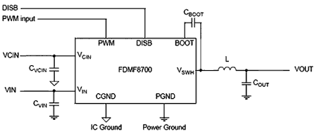 混合集成電路FDMF8700為Fairchild公司推出的采用混合集成電路設(shè)計方案2的一種產(chǎn)品,其特點(diǎn)有:輸入電壓典型值12V,開關(guān)頻率可達(dá)500kHz,輸出電流可達(dá)30A,器件內(nèi)在的適應(yīng)性門驅(qū)動,內(nèi)部集成的自舉二極管,器件效率大于90%,低壓鎖定,輸出電壓可禁止,采用微型SMD封裝形式,產(chǎn)品制造使用無鉛材料。FDMF8700電源變換器的典型應(yīng)用電路如圖3所示。
