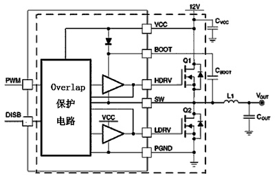 采用方案2設(shè)計的混合集成電路DC/DC變換器中,兩個MOSFET器件具有互補(bǔ)的作用,以降低開關(guān)損耗,而這兩個器件的設(shè)計位置可根據(jù)設(shè)計者的實(shí)際需要進(jìn)行布局。該芯片還內(nèi)置直通保護(hù)電路,可以有效防止電路上下橋臂的直通,大大地提高了電路的可靠性。在驅(qū)動電路設(shè)計部分,不僅比常規(guī)的電源變換設(shè)計增加了驅(qū)動能力,減少M(fèi)OSFET的開通關(guān)斷損耗,還把Boost-trap二極管也集成在芯片內(nèi)部,以簡化外部用戶系統(tǒng)電路的設(shè)計。