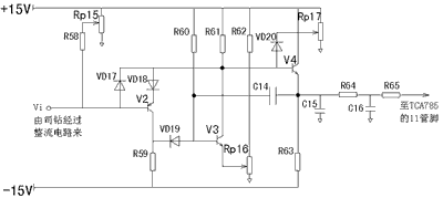 直流電平移動控制電路如圖5所示,是非常適合于對TCA785的引腳11進(jìn)行調(diào)節(jié)和控制的電路,由于來自司鉆的交流電(0~24V)經(jīng)整流后的直流電平其可調(diào)范圍并不是正好對應(yīng)于0°~120°的移相范圍,因此利用圖5所示的直流電平移動電路可以方便地進(jìn)行移相角度限制和匹配,即調(diào)節(jié)滑動變阻器RP15,可以使直流電平VT的范圍整體向上移動或向下移動,即在晶閘管導(dǎo)通角不變的情況下使α角同時向前或向后移動。而對RP17的調(diào)節(jié),如果增加其阻值,則使直流電平VT向上移動,即限制了它的值,亦即限制了α的值。而對RP16的調(diào)節(jié),如果增加其阻值,則使直流電平VT向下移動,即限制了它的值,亦即限制了α的值。因此移相范圍的界定由此電路可方便的調(diào)節(jié)和控制,即使在調(diào)試時由于電路的參數(shù)選擇不太恰當(dāng)以致對α的大小限制不好協(xié)調(diào)控制時,可通過調(diào)節(jié)TCA785的引腳9外接的可變電阻來控制其內(nèi)部所產(chǎn)生的鋸齒波的斜率,二者兼顧,即可滿足要求。