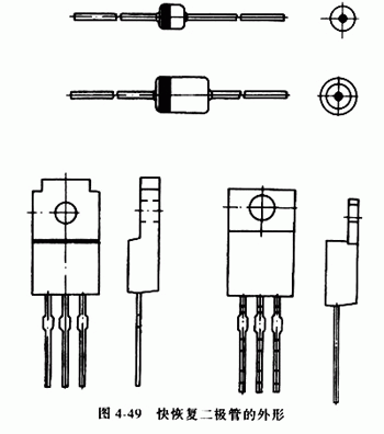 通常,5~20A的快恢復二極管管采用TO–220FP塑料封裝,20A以上的大功率快恢復二極管采用頂部帶金屬散熱片的TO–3P塑料封裝,5A以下的快恢復二極管則采用DO–41、DO–15或DO–27等規(guī)格塑料封裝。圖4-49是快恢復二極管的外形。