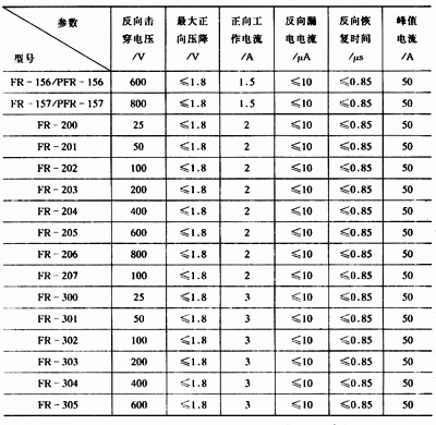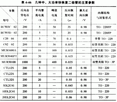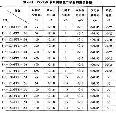 2.常用的快恢復二極管 常用的小功率快恢復二極管有FR系列和PFR系列等,其主要參數(shù)見表4-45。常用的中、大功率快恢復二極管有RC系列、MUR系列、CTL系列等其主要參數(shù)見表4-46。