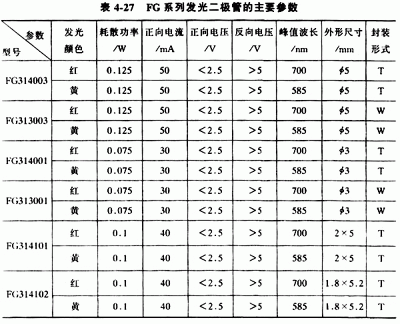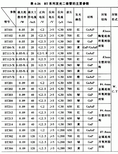 常用的國(guó)產(chǎn)普通單色發(fā)光二極管有BT(廠標(biāo)型號(hào))系列、FG(部標(biāo)型號(hào))系列和2EF系列,見表4-26、表4-27和表4-28。