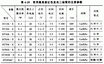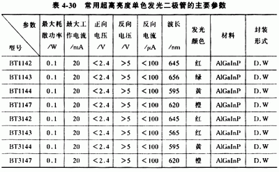 常用的高亮度紅色發(fā)光二極管的主要參數(shù)見表4-29,常用的超高亮度單色發(fā)光二極管的主要參數(shù)見表4-30。