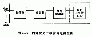 6.閃爍發(fā)光二極管 閃爍發(fā)光二極管(BTS)是一種由CMOS集成電路和發(fā)光二極管組成的特殊發(fā)光器件,可用于報(bào)警指示及欠壓、超壓指示。其外形、內(nèi)部結(jié)構(gòu)圖及內(nèi)電路框圖見圖4-26和圖4-27。