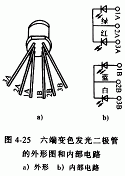 圖4-25是六端變色發(fā)光二極管的外形和內(nèi)部電路