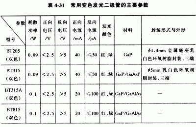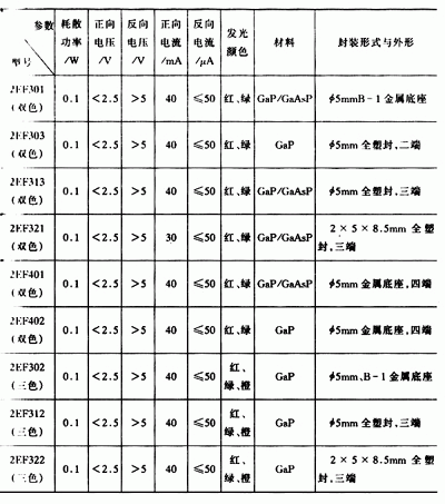 常用的雙色發(fā)光二極管有2EF系列和TB系列,常用的三色發(fā)光二極管有2EF302、2EF312、2EF322等型號(hào),見表4-31。
