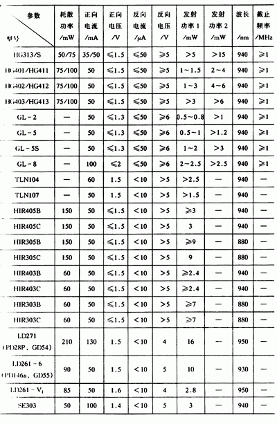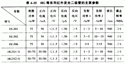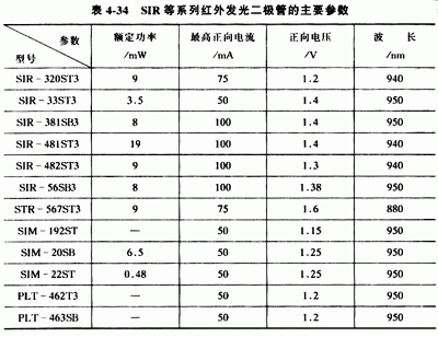 常用的紅外發(fā)光二極管有SIR系列、SIM系列、PLT系列、GL系列、HIR系列和HG系列等,見表4-34和表4-35。