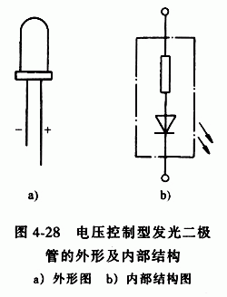 圖4-28是電壓控制型發(fā)光二極管的外形胩內(nèi)部結(jié)構(gòu)圖。