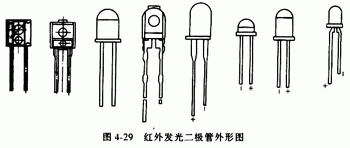 8.紅外發(fā)光二極管 紅外發(fā)光二極管也稱紅外線發(fā)射二極管,它是可以將電能直接轉(zhuǎn)換成紅外光(不可見光)并能輻射出去的發(fā)光器件,主要應(yīng)用于各種光控及遙控發(fā)射電路中。其外形圖見圖4-29。