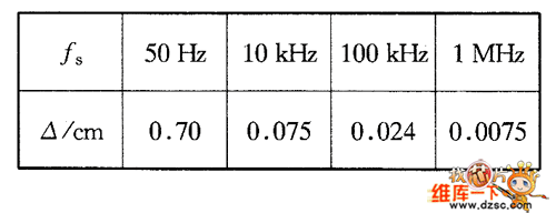 △值與溫度有關(guān),100℃時銅電阻率ρ=2.3×1o-6Ω·cm,μ。為空氣磁導率,fs為電流頻率,表6-3為計算所得的幾個典型頻率的△值。