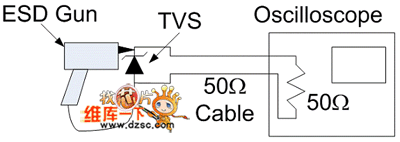 比較保護(hù)二極管鉗位電壓的途徑是采用一臺(tái)示波器截取保護(hù)二極管兩端在ESD產(chǎn)生期間內(nèi)的實(shí)際電壓波形,可以根據(jù)圖2的測(cè)試設(shè)置來(lái)實(shí)現(xiàn)。
