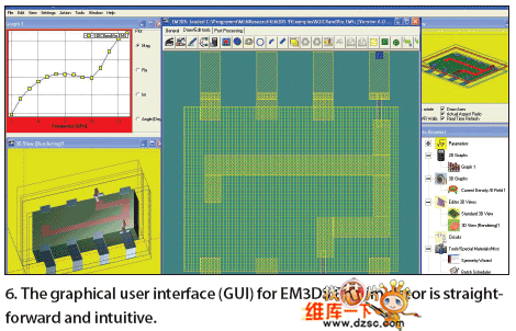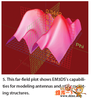 ?。牛停常模釉试S設(shè)定任何參數(shù)。它還允許通過(guò)輸入頻率依賴(lài)的表達(dá)式來(lái)定義材料,通過(guò)內(nèi)部分析器幫助創(chuàng)建模型。這向用戶(hù)提供了一個(gè)創(chuàng)建原始模型的必要自由。EM3DS通過(guò)將其封裝在金屬盒內(nèi)來(lái)分析結(jié)構(gòu)。這使得模型屏蔽結(jié)構(gòu)成為可能,并使得仿真引擎更加準(zhǔn)確,這是因?yàn)榉忾]邊界的方法提供了高的動(dòng)態(tài)范圍。對(duì)天線(xiàn)進(jìn)行建模,在盒子的頂部和底部覆蓋處可以使用吸收邊界。EM3DS的2007版包括了幾項(xiàng)新的圖表(極化圖、遠(yuǎn)場(chǎng)2-D圖、遠(yuǎn)場(chǎng)3-D圖),用以幫助設(shè)計(jì)天線(xiàn)(圖5)。