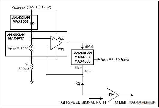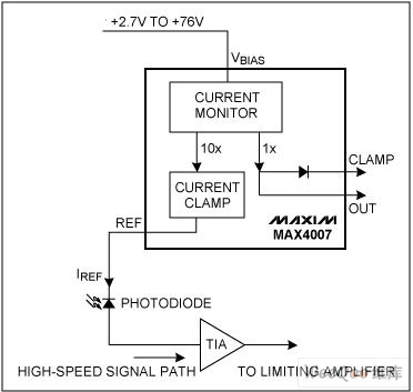 MAX4007/MAX4008為高、高邊、高壓電流監(jiān)測器,設(shè)計(jì)用于監(jiān)測光電二極管的電流。這兩款器件提供了一個(gè)用于基準(zhǔn)電流的連接點(diǎn)(REF)和一路正比于基準(zhǔn)電流的檢測輸出。在IC的REF引腳處連接適當(dāng)?shù)腁PD (雪崩光電二極管)或PIN (陽極-本征-陰極)光電二極管,如圖1所示。REF引腳向光電二極管陰極源出電流。