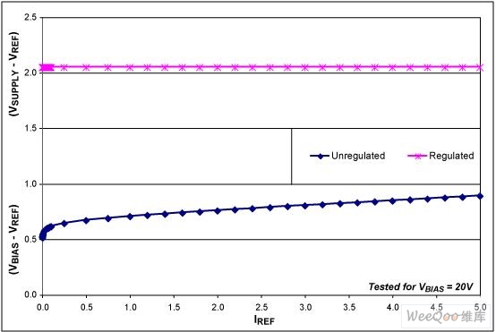 圖2所示為基準(zhǔn)電壓隨REF電流IREF的變化關(guān)系。該圖給出了傳統(tǒng)的未經(jīng)穩(wěn)壓的電路測試結(jié)果,光電二極管電流在1μA至4mA范圍內(nèi)變化時(shí),VREF變化量高達(dá)0.4V。在一些應(yīng)用中,可能無法接受如此大的VREF變化。對(duì)REF電壓進(jìn)行穩(wěn)壓時(shí)的問題在于VBIAS可能高達(dá)76V。