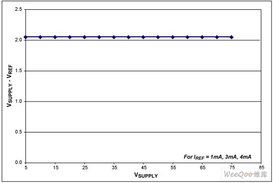 圖4. 對(duì)應(yīng)于不同偏置電流,VSUPPLY - VREF隨VSUPPLY的變化曲線。