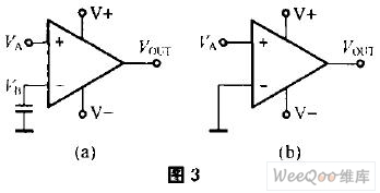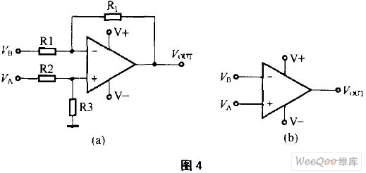 圖4(a)由運算放大器組成的差分放大器電路,輸入電壓VA經(jīng)分壓器R2、R3分壓后接在同相端,VB通過輸入電阻R1接在反相端,RF為反饋電阻,若不考慮輸入失調(diào)電壓,則其輸出電壓Vout與VA、VB及4個電阻的關(guān)系式為:Vout=(1+RF/R1)·R3/(R2+R3)VA-(RF/R1)VB。若R1=R2,R3=RF,則Vout=RF/R1(VA-VB),RF/R1為放大器的增益。當R1=R2=0(相當于R1、R2短路),R3=RF=∞(相當于R3、RF開路)時,Vout=∞。增益成為無窮大,其電路圖就形成圖4(b)的樣子,差分放大器處于開環(huán)狀態(tài),它就是比較器電路。實際上,運放處于開環(huán)狀態(tài)時,其增益并非無窮大,而Vout輸出是飽和電壓,它小于正負電源電壓,也不可能是無窮大。