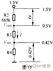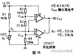 溫度傳感器采用NTC熱敏電阻RT,已知RT在0℃時阻值為333.1kΩ;5℃時阻值為258.3kΩ,則按1.5V工作電壓及流過R1、RT的電流約1.5 uA,可求出R1的值。R1的值確定后,可計算出0℃時的VA值為0.5V(按圖10中R1=665kΩ時),5℃時的VA值為0.42V,則VTHL=0.42V,VTHH=0.5V。若設R2=665kΩ,則按圖11,可求出流過R2、R3、R4電阻的電流I=(1.5V-0.5V)/665kΩ=0.0015mA,按R4×I/=0.42V,可求出R4=280kΩ再按0.5V=(R3+R4)0.0015mA, 則可求出R3=53.3kΩ。