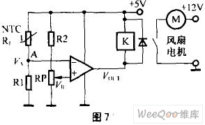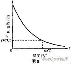 從圖7可看出,要改變閾值溫度TTH十分方便,只要相應地改變VTH值即可。VTH值增大,TTH增大;反之亦然,調(diào)整十分方便。只要RT確定,RT的溫度特性確定,則R1、R2、RP可方便求出(設流過RT、R1及R2、RP的電流各為0.1~0.5mA)。