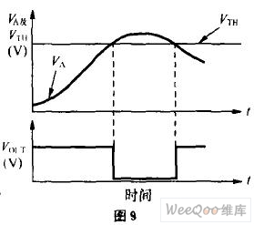 設計時希望散熱片上的溫度一旦超過80℃時接通散熱風扇實現(xiàn)散熱,則VTH的值應等于80℃時的K值。一旦VA>VTH,則比較器輸出低電平,繼電器K吸合,散熱風扇(直流電機)得電工作,使大功率器件降溫。VA、VTH電壓變化及比較器輸出電壓Vout的特性如圖9所示。這里要說清楚的是在VA開始大于VTH時,風扇工作,但散熱體有較大的熱量,要經(jīng)過一定時問才能把溫度降到80℃以下。