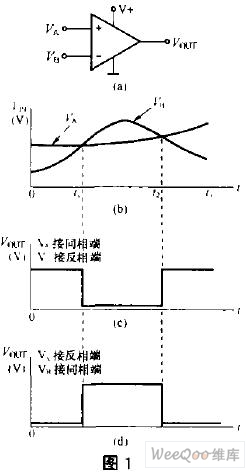 如果把VA輸入到反相端,VB輸入到同相端,VA及VB的電壓變化仍然如圖1(b)所示,則Vout輸出如圖1(d)所示。與圖1(c)比較,其輸出電平倒了一下。輸出電平變化與VA、VB的輸入端有關(guān)。