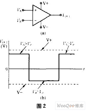 圖2(a)是雙電源(正負電源)供電的比較器。如果它的VA、VB輸入電壓如圖1(b)那樣,它的輸出特性如圖2(b)所示。VB>VA時,Vout輸出飽和負電壓。