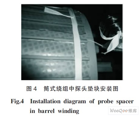 ?。?)在筒式繞組中的安裝。在筒式繞組中由于沒有水平撐條,因此,為了不破壞繞組絕緣結(jié)構(gòu),將探頭安裝在垂直撐條上。安裝時在垂直撐條上開槽,開槽高度為事先計算好的熱點高度。在撐條對應(yīng)的位置開槽,探頭應(yīng)能與繞組接觸,如圖4 所示。
