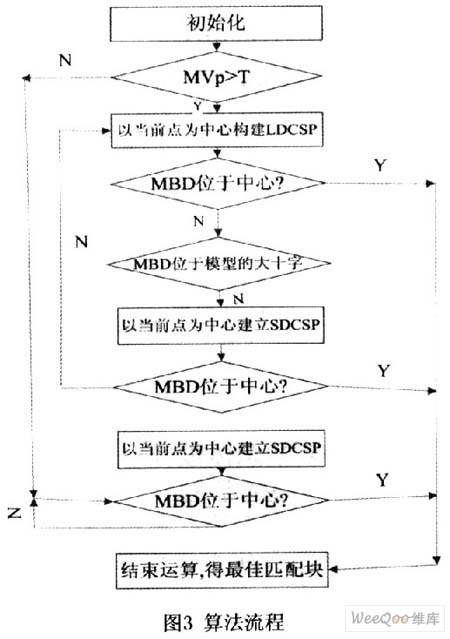 Step 5:用LDCSP在搜索區(qū)域中心及周圍5個點進行匹配運算,然后判斷,找出MBD點。若MBD點位于中心點,所得MBD點為所求;否則繼續(xù)Step 5。算法流程圖如圖3所示。
