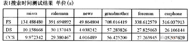為了時間測試的準確性,測試時采用的是VC++提供的兩個時間函數(shù):QueryPerformanceFrequency()和OuerPerformanceCounter()對標準測試序列missa、salesman、news、grandmother、foreman、carphone進行測定,得表1(數(shù)據(jù)均為三次測量所求得的平均值)。