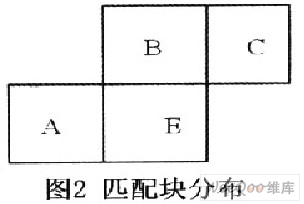 運動矢量空間域的預(yù)測方式有運動矢量中值預(yù)測、空間域的上層塊模式運動矢量;在時間域的預(yù)測方式有前幀對應(yīng)塊運動矢量預(yù)測和時間域的鄰近參考幀運動矢量預(yù)測。本文采用運動矢量中值預(yù)測方式。根據(jù)與當(dāng)前E塊相鄰的左邊A塊,上邊B塊和右上邊C塊的運動矢量,取中值作為當(dāng)前塊的預(yù)測運動矢量。如圖2所示。