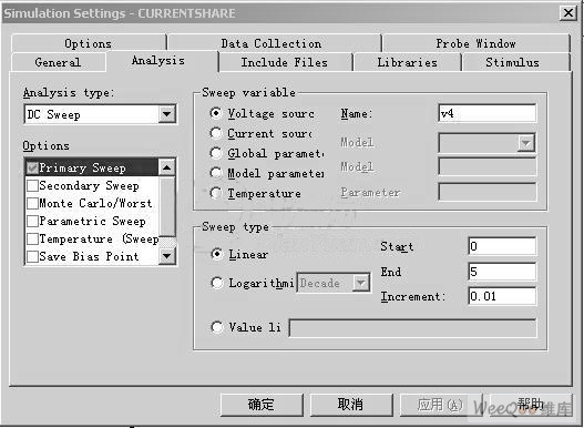 再從菜單windows回到電路圖窗口,進(jìn)行直流掃描仿真,設(shè)定我們反串的電壓源從0V掃描到5V,步長(zhǎng)0.01V。
