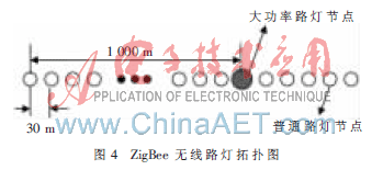 這種增強(qiáng)的路由節(jié)點(diǎn)好比一個(gè)通信基站,大功率ZigBee模塊輸出功率可以達(dá)到100 mW(20 dBm),比一般的節(jié)點(diǎn)要多出90 mW,接收靈敏度也比普通節(jié)點(diǎn)增加8 dBm,通信覆蓋面積可以達(dá)到半徑1 500 m.ZigBee無線路燈拓?fù)鋱D如圖4所示。