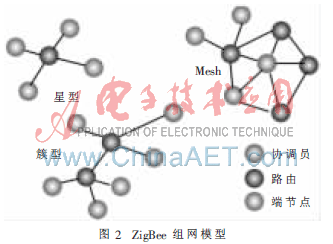 ZigBee技術(shù)的網(wǎng)絡(luò)特性比較突出,數(shù)據(jù)傳輸采用接力式,協(xié)議中允許網(wǎng)絡(luò)中包含三種不同的角色,其中功能的角色如路由節(jié)點(diǎn)和協(xié)調(diào)器節(jié)點(diǎn)具備路由的功能,可以實(shí)現(xiàn)數(shù)據(jù)的轉(zhuǎn)發(fā),因此可以組建大規(guī)模的網(wǎng)絡(luò)(可達(dá)6萬個(gè)),在Mesh網(wǎng)絡(luò)結(jié)構(gòu)中,每個(gè)節(jié)點(diǎn)的角色都是路由器,既有實(shí)際功能又同時(shí)可以幫助其他節(jié)點(diǎn)轉(zhuǎn)發(fā)數(shù)據(jù)。ZigBee組網(wǎng)模型如圖2所示。