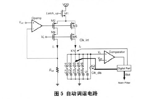 這里△t為外部參考時鐘周期,經(jīng)過調(diào)諧Rref與c的乘積約等于△t,終滿足Vc=Vref,完成調(diào)諧。為了降低功耗,當調(diào)諧過程結(jié)束時,調(diào)諧電路將被關(guān)閉。在圖5中,M1通過Latch_up控制信號,控制其關(guān)閉與打開。終調(diào)諧電路將發(fā)送5位調(diào)諧碼到主體濾波器電路,從而控制主體濾波器電路中的電容陣列的電容選擇性接入與釋放,至此整個濾波器調(diào)諧過程結(jié)束。