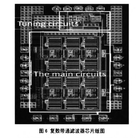本文設(shè)計的復數(shù)帶通濾波器采用了0.18umTSMC工藝,芯片工作在1.8V電源電壓下,仿真工具Cadence Spectre。整個芯片帶焊盤后的版圖如圖6所示.總面積為1.2mm×1.6mm。