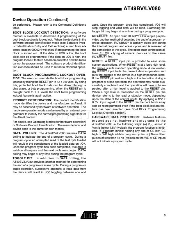 The AT49BV/LV080 are 3-volt-only in-system Flash Memory devices. Their 8 mega-