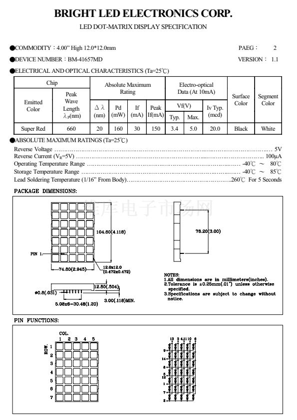 BRIGHT LED ELECTRONICS CORP [LED DOT MATRIX DISPLAY SPECIFI...