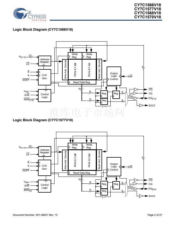 8-bit words (CY7C1566V18), 9-bit words (CY7C1577V18),