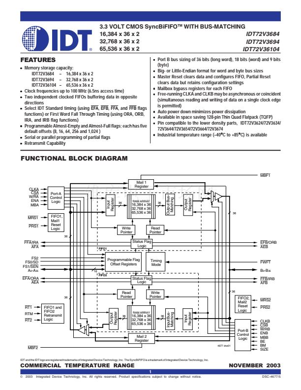 IDT72V36104 鈥?65,536 x 36 x 2