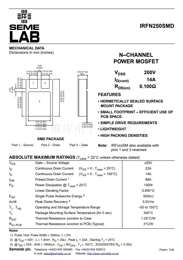 POWER MOSFET N-CHANNEL(BVdss=200V, Rds(on)=0.18ohm, Id=18A)