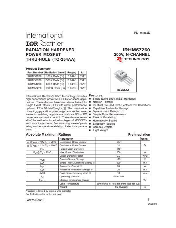 RADIATION HARDENED POWER MOSFET THRU-HOLE(T0-254AA)